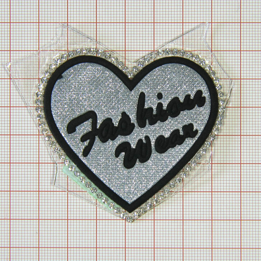 Аппликация клеевая глиттер стразы Сердце Fashion 6*5,5см серебро, черный, белые камни, шт