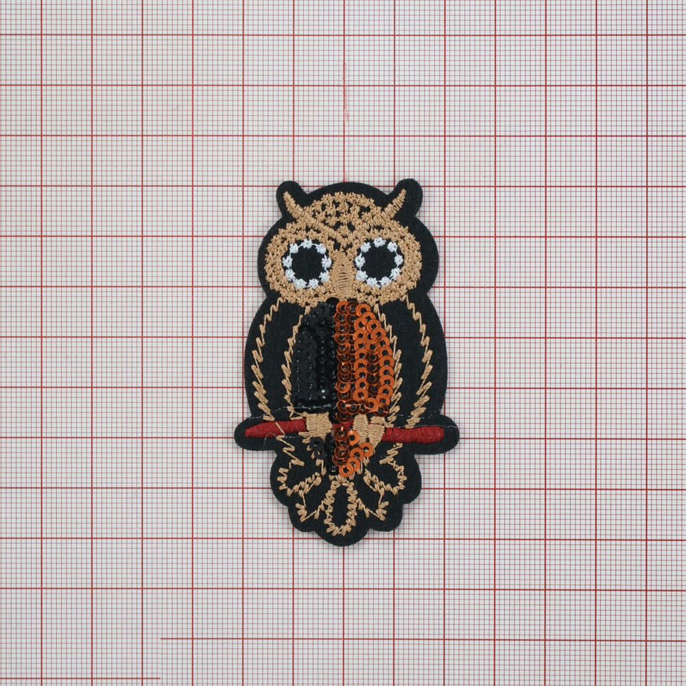 Аппликация клеевая пайетки Сова 4,5*7,5см черный, бежевый, белый, красный, черные, золотые пайетки, шт