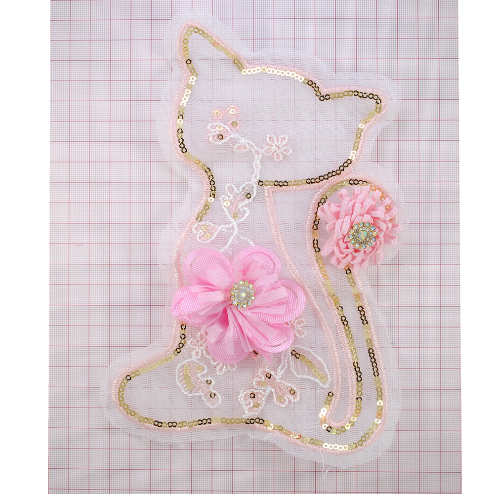 Аппликация приш. пайетки и стразы Кошка, 11*19см, белый, золотые пайетки, роз. цветы, вышивка, шт