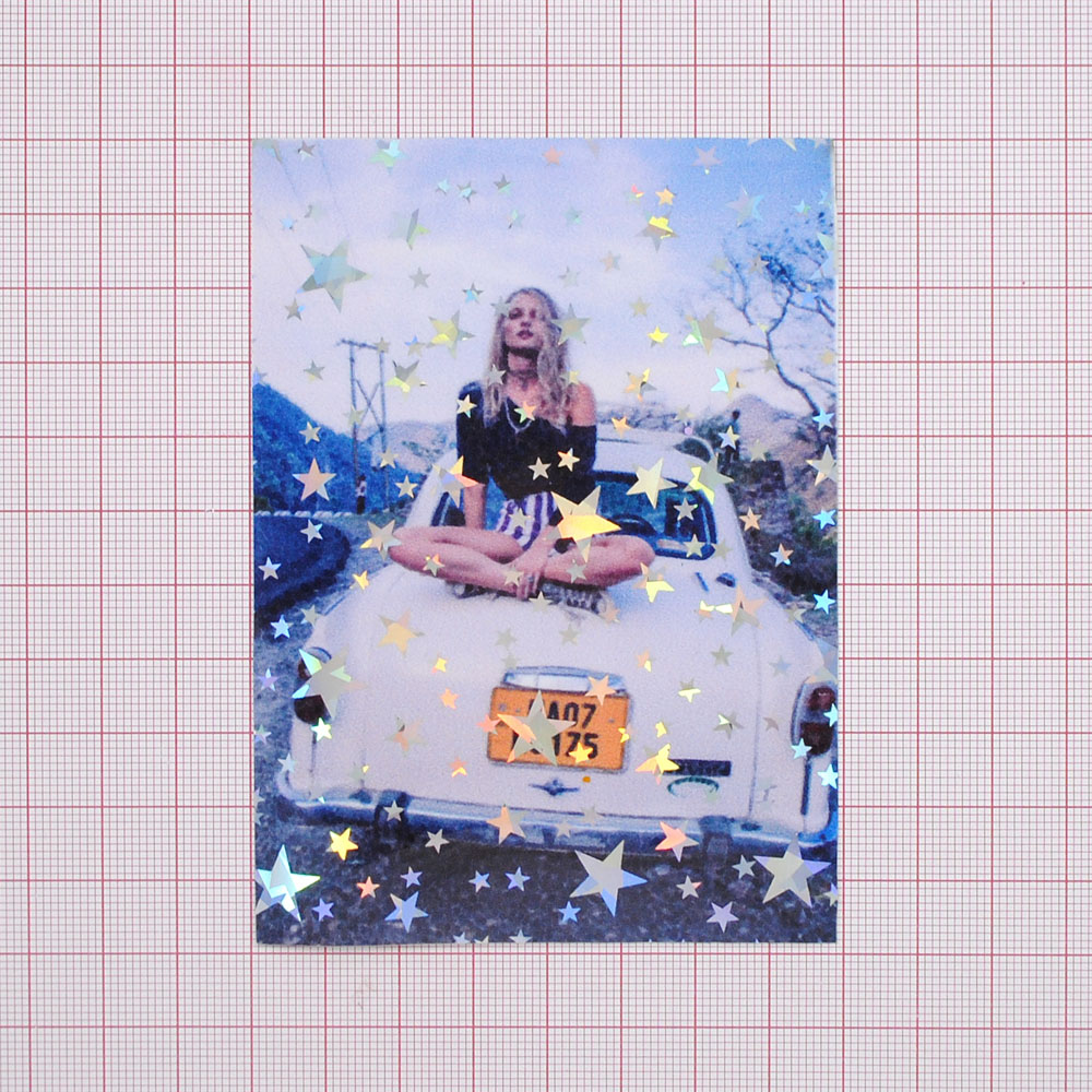 Аппликация клеенка пришивная Девушка на машине, 8*11см, белый, черный, розовый, звезды хамелеон, шт