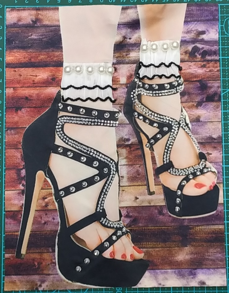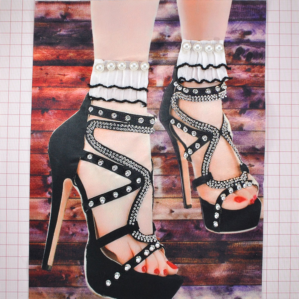 Аппликация пришивная со стразами и металлическими заклепками. Босоножки, 25*20см, черный, белый, жемчуг, шт