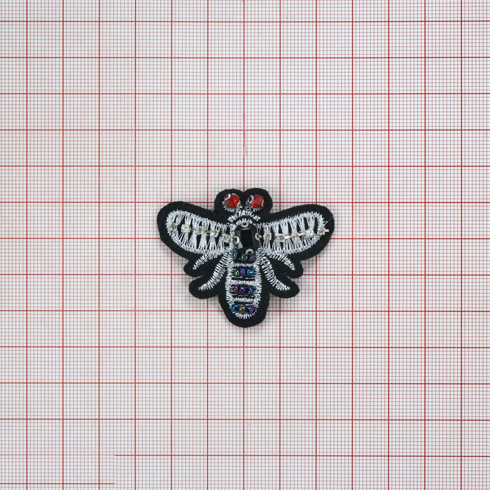 Аппликация пришивная бисер Муха черно-серебряная 5*4см черный, вышивка серебро, белый, красные камни, цветной бисер
