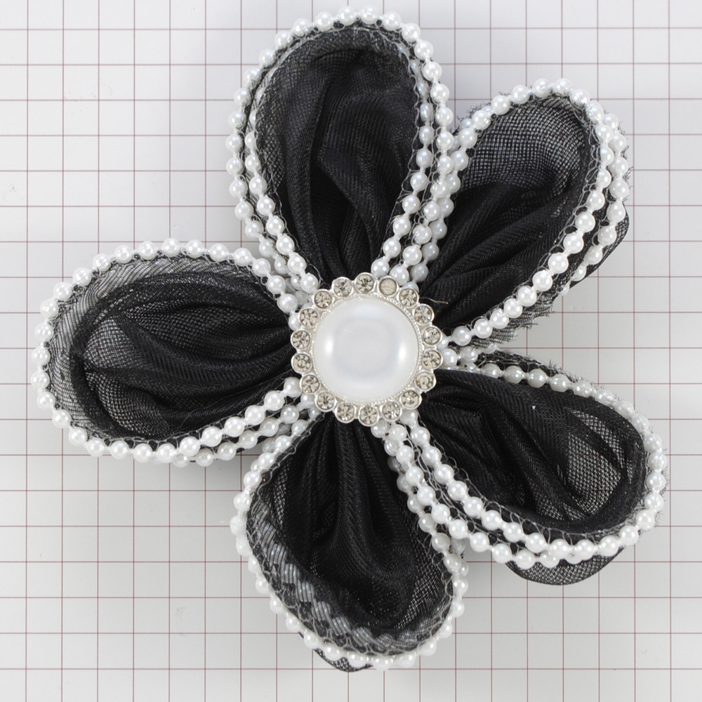 Аппл.цветок фатин с жемч., 9*9см., черн., бел., стразы, перламутровый камень, шт.