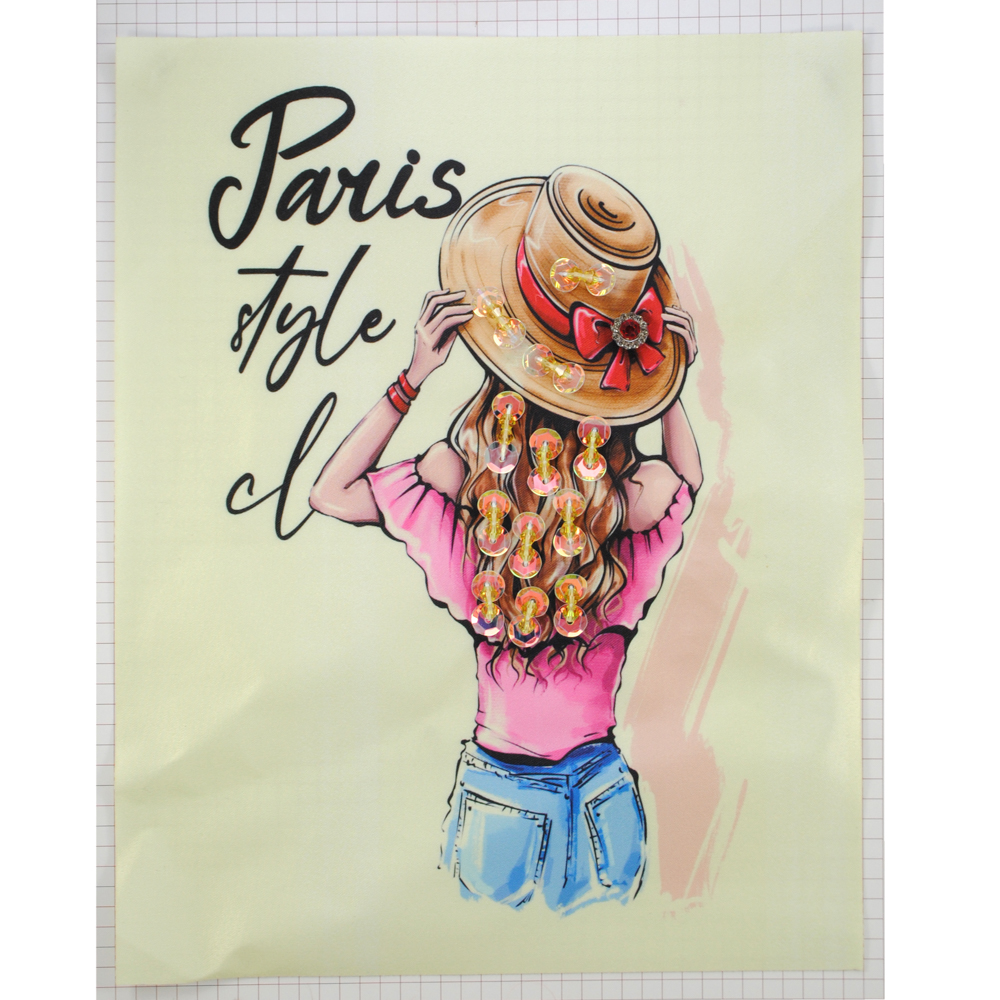 Аппликация пришивная с пайетками и стразами Девушка в шляпе Paris, 18,8*23,9см, черный, белый, розовый, синий, шт