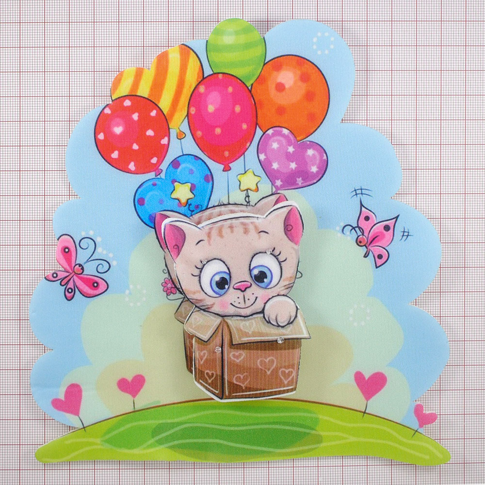 Аппликация тканевая пришивная 3D Котик с шариками, 17*18см, черный, белый, розовый, желтый, зеленый, синий, шт