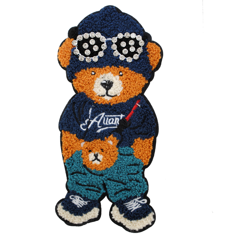 Аппликация тканевая махра со стразами Мишка, 25*11,7см, коричневый, синий, белый, голубой, белые камни, шт