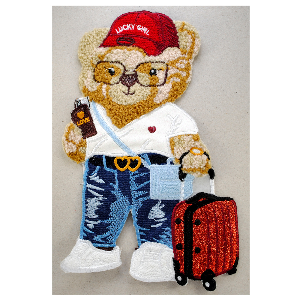 Аппликация тканевая пришивная Мишка с чемоданом, 25*16см, красный, черный, белый, синий, шт