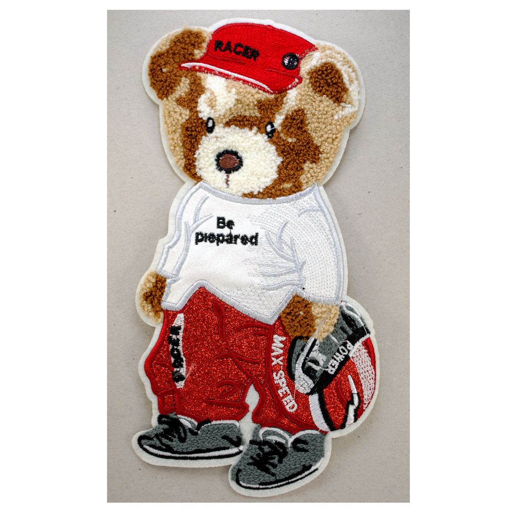 Аппликация тканевая пришивная Мишка в кепке, 26*13,3см, коричневый, бежевый, красный, белый, шт