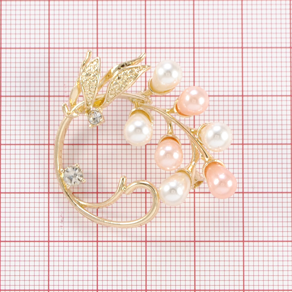 Брошь мет. стразы веточка, 3,5*4см, бел., роз., жемч., золото, шт