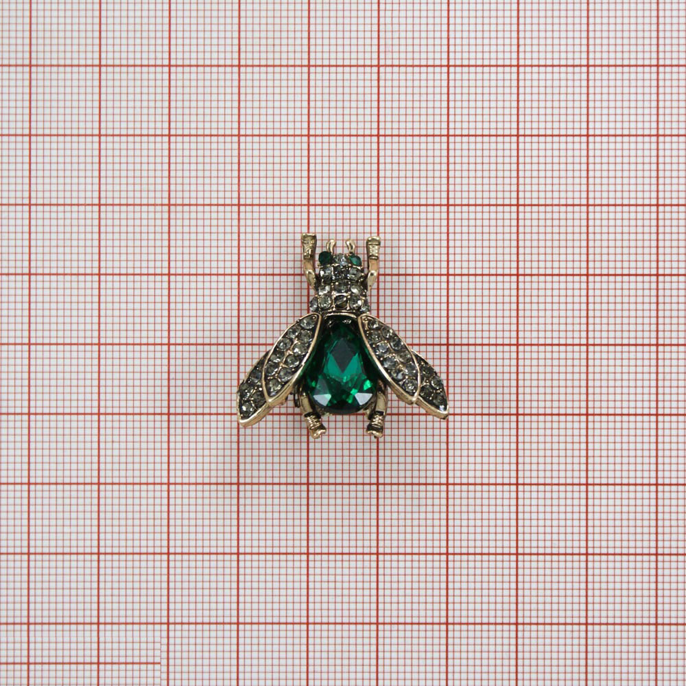 Брошь Муха 30*30мм OLD GOLD белые и зеленые камни, шт