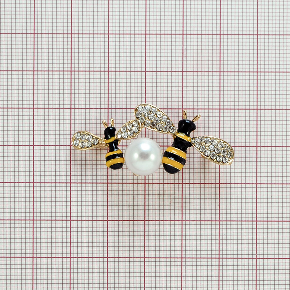 Брошь Осы и жемчуг светлое золото, желтый, черная эмаль, белый жемчуг, белые камни