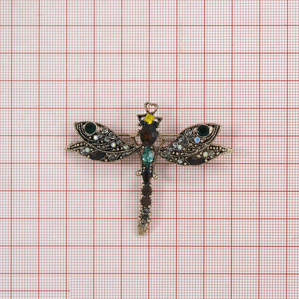 Брошь Стрекоза 60*50мм OLD GOLD и зеленые, янтарные и хамелеон камни, шт