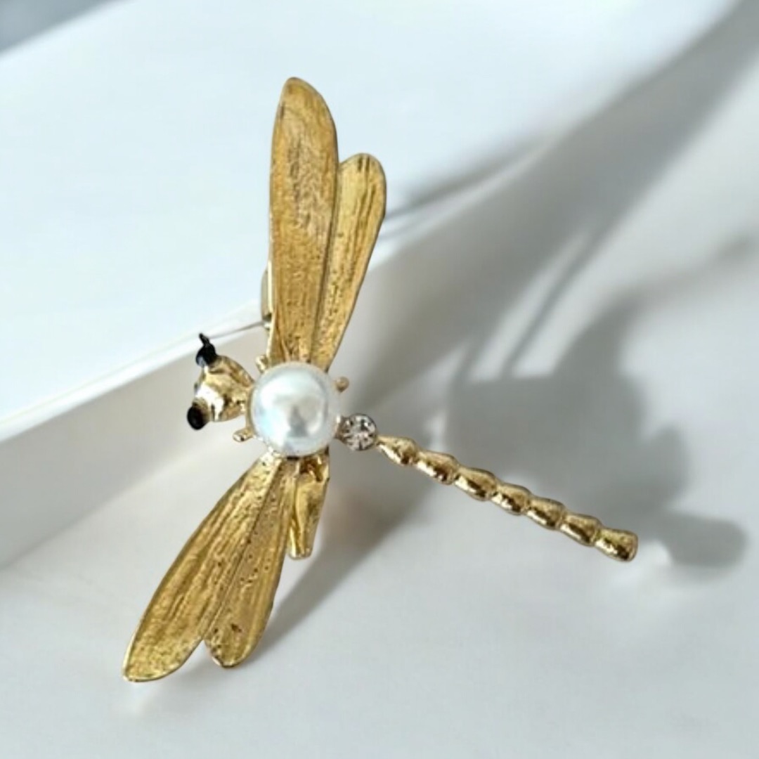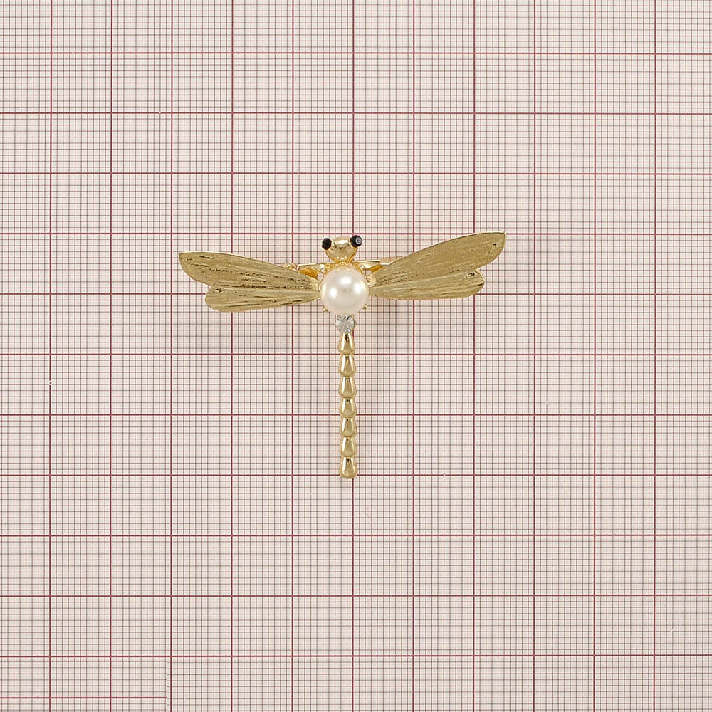 Брошь Стрекоза золото и белый жемчуг, черные камни, шт