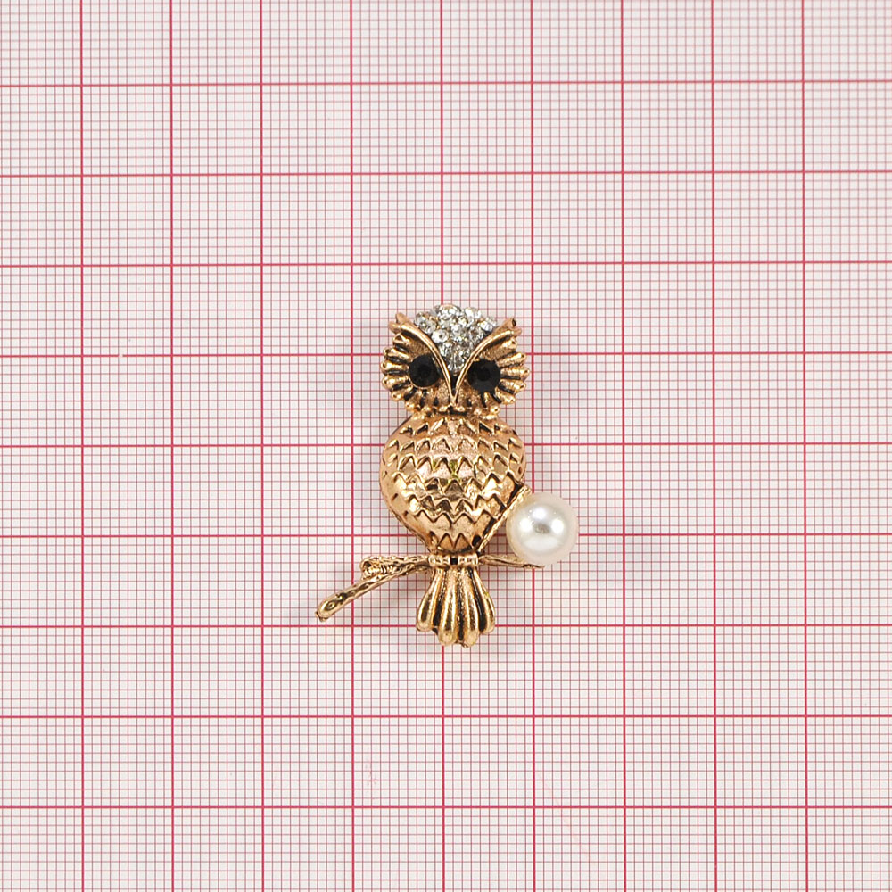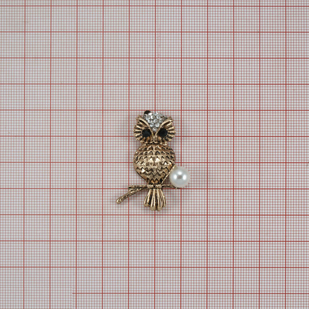 Краб металл Сова на ветке 39*28мм ANTIC GOLD, черные, белые камни, белый жемчуг, шт