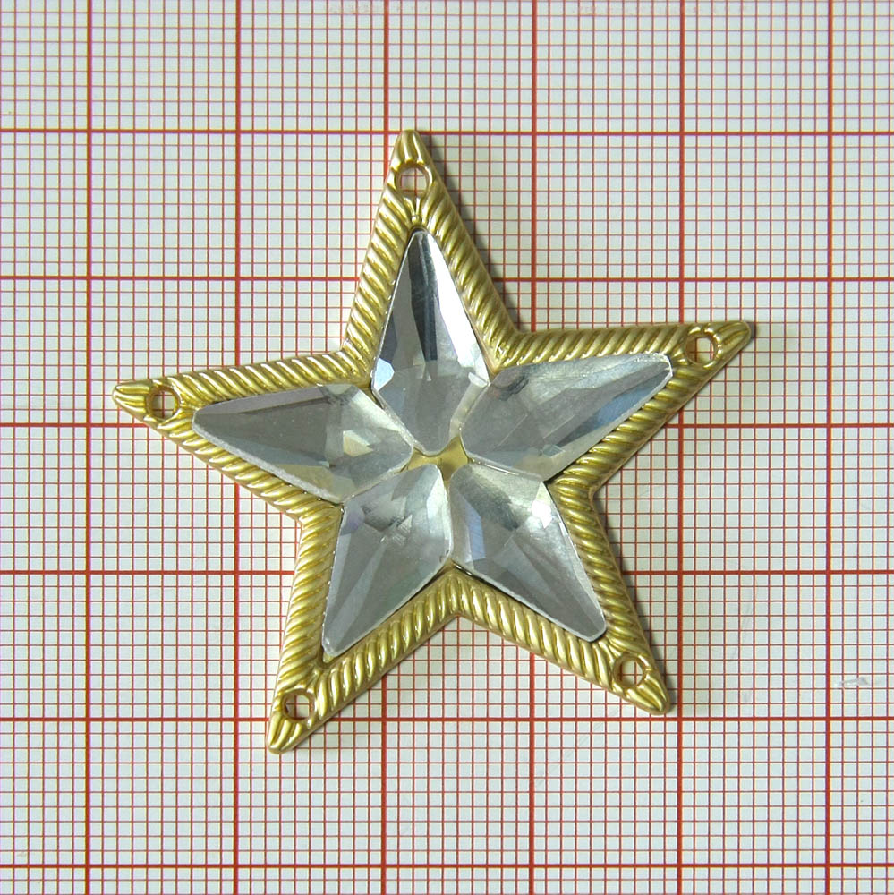 Лейба металл ЗВЕЗДА 43*43мм фигурная, пришивная с 5 отверстиями GOLD, белые камни