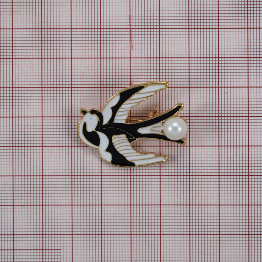 Брошь Ласточка золото, черная и белая эмаль, белый жемчуг