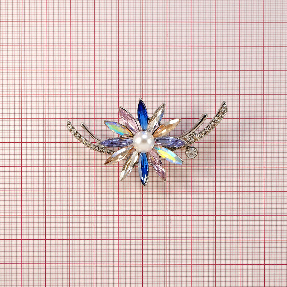 Брошь Цветок 12 NIKEL, белый жемчуг, цветные камни, шт