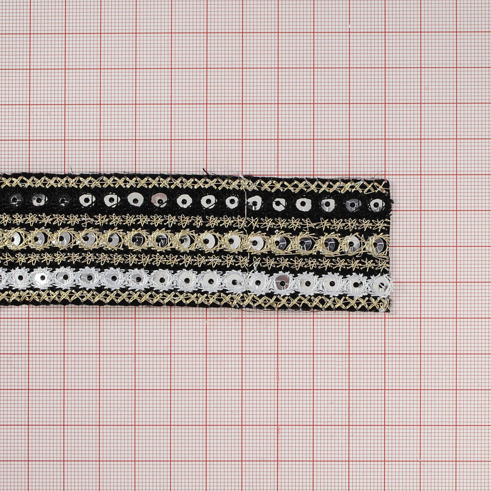 Тесьма Орнамент 4см, черный и золотой люрекс, серебряные пайетки, 15ярд