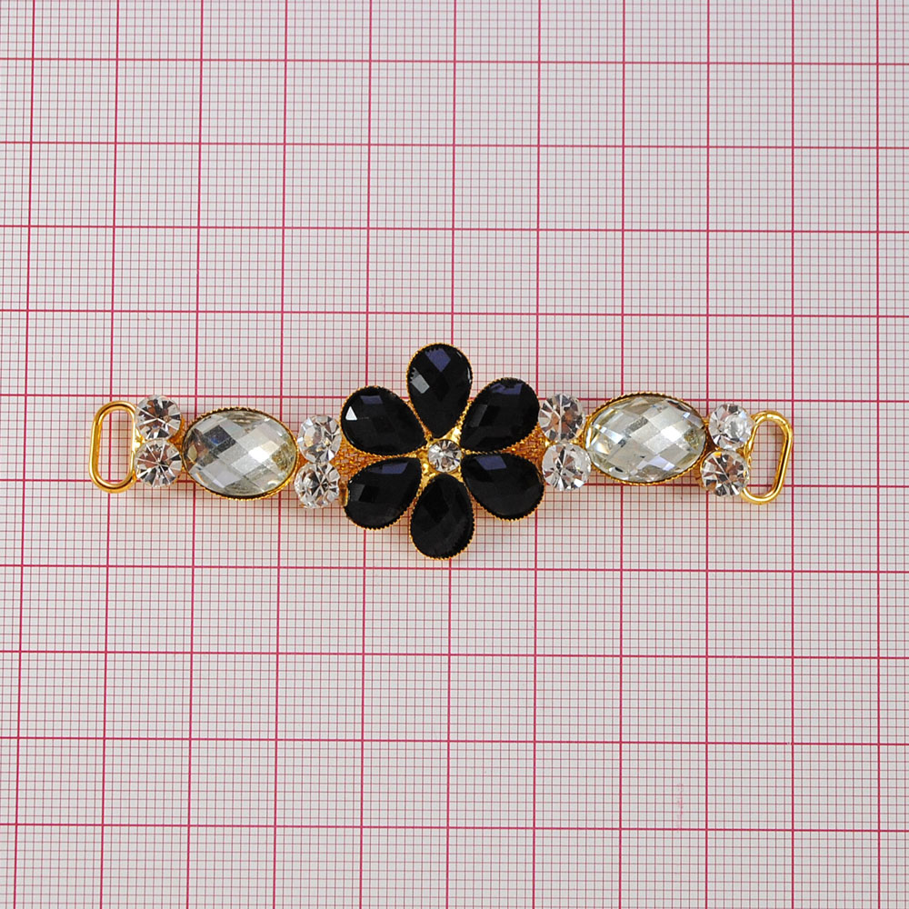 Укр.стекл. 9896 перетяж. 8*2,1см GOLD, цветок-6 черн.камней капля, 2 крупн. бел. овал