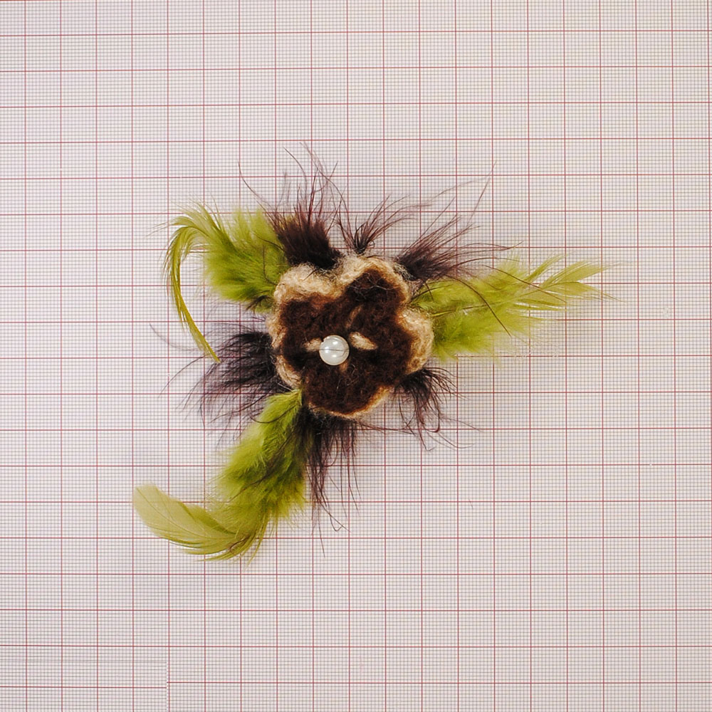 Брошь RF-310, цветок из мохера с бусиной, зеленые и коричневые перья