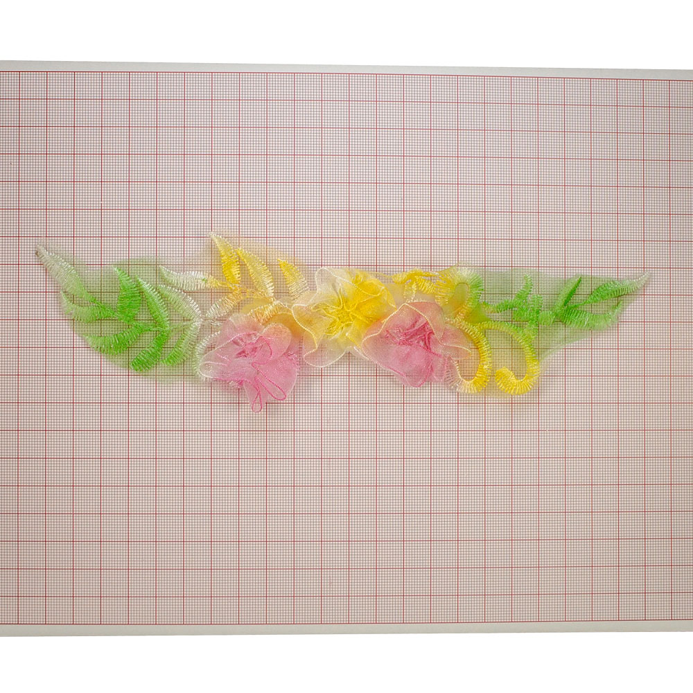 Отделка сетка, 23см, зеленая ветка вышитая с бело-желтыми цветами