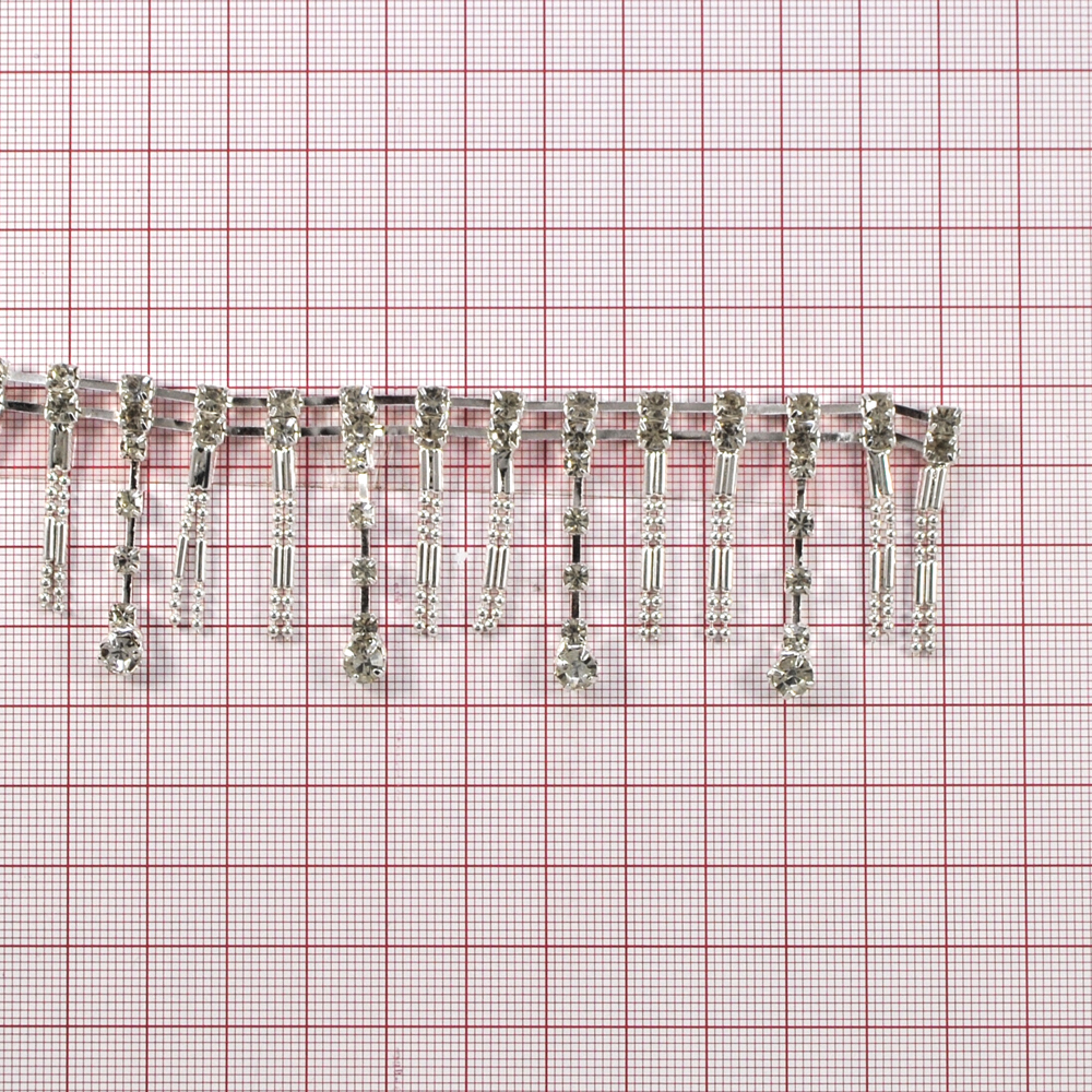 Тесьма стразы Бахрома с двойными подвесками, 3,7см, никель, белый, ярд