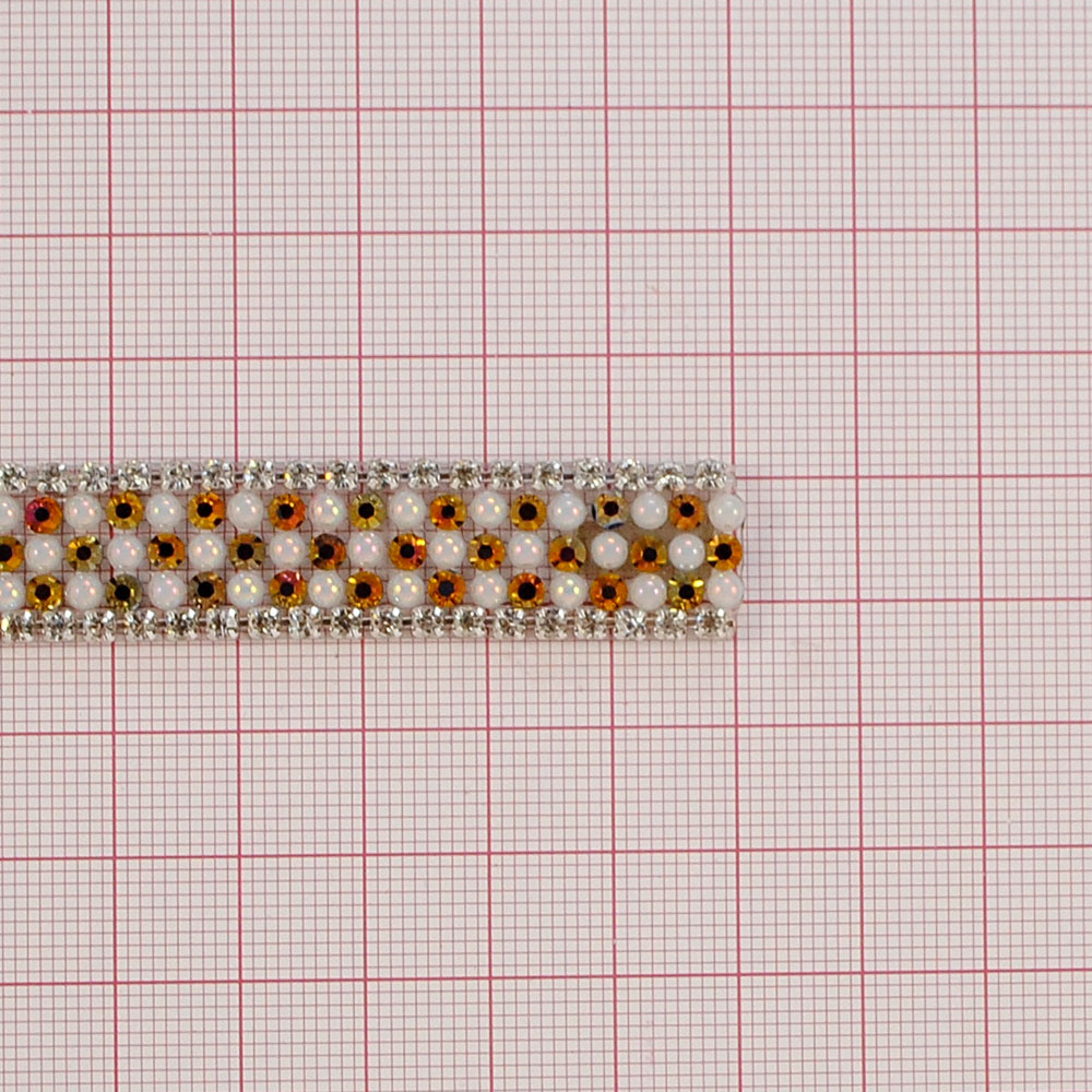 Тесьма стразы клеевые C1-1,1,4см. NIKEL, камни красный хамелеон, белый жемчуг, ярд